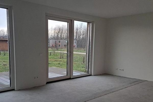 In de hal aan je rechterkant zie je drie deuren en de trap. De eerste deur geeft toegang tot de technische ruimte. De tweede deur is van de meterkast en de derde leidt naar het toilet (uiteraard hangend en met een fonteintje). Van hieruit loop je naar de woonkamer. Een fijne lichte ruimte met deur naar de eigen terras van 20m2. Want ook deze woning heeft zowel voor als achter plek om buiten te zitten. Van hieruit is je uitzicht groener dan groen. Geen buren te zien! De moderne keuken aan de voorzijde van de woning heeft een lichte kleurstelling en moderne grepen. Hij is van alle gemakken voorzien. Je kookt uiteraard op inductie want de woning is all-electric. Verder tref je hier een inbouw combimagnetron, een geïntegreerde vaatwasser en afzuigkap. Vanuit de keuken heb je goed zicht op de gezelligheid van je buurt. De grote pui heeft ramen tot de grond. Wie de trap naar boven neemt, zal verrast worden door de twee ruime slaapkamers. De masterbedroom kreeg een royale afmeting van 14,6 m2. Je hebt hier alle ruimte om de kamer meerdere functies te geven; slaapkamer, werkkamer, kleedkamer. Het kan allemaal! De tweede slaapkamer mag er ook zijn met 10,8 m2. Tenslotte is er nog de ruim opgezette badkamer (6,7 m2). Functioneel en netjes ingericht met een wastafel met kraan, spiegel en glazen planchet, een glazen douchewand, handdouche met glijstang en een elektrische wandradiator. Ook is er plek voor de wasmachine en eventueel de droger. Het hangende toilet krijgt een glazen achterwand, wel zo hygiënisch. De bergingen zijn in groepjes geplaatst in de buurt van de woning. Hier kun je je fiets kwijt. Je auto zet je op een van de gemeenschappelijke parkeerplaatsen aan de rand van de kamer. Je ziet hier alleen maar fietsen, want de kamers zijn autovrij. Wel zo veilig voor de kinderen die hier zorgeloos kunnen spelen. Auto’s staan bij elkaar op een van de parkeerplaatsen aan de rand de kamer.