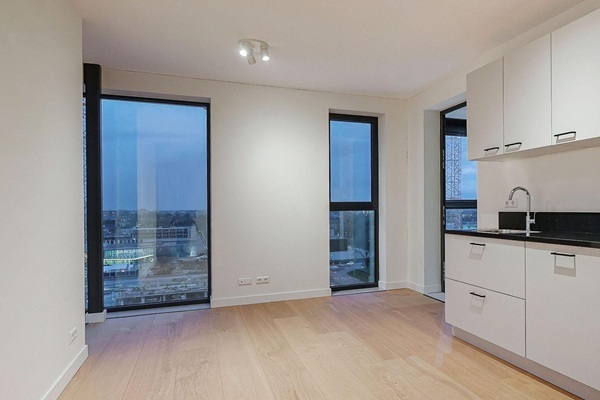 U komt binnen in een ruime hal met de meterkast, kast voor de stadsverwarming en de mechanische ventilatie. De woonkamer heeft een open keuken met inbouwapparatuur. Er is een inductiekookplaat, koeler, combi-magnetron, afzuigkap en een vaatwasser. De badkamer heeft een wastafel en een douche. Het toilet is apart. Er is ook een berging in het appartement met de aansluiting voor een wasmachine. Woning is voorzien van vloerverwarming.