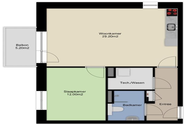 INDELING Algemeen: - Entree met bellentableau en toegang tot het complex. - Trapopgang en lift naar verdieping; Appartement: - Entree; - Inpandige berging met aansluiting wasapparatuur;; - Betegelde badkamer voorzien van inloopdouche, toilet en wastafel; - Woonkamer met toegang tot balkon; - Nette keuken voorzien van diverse inbouwapparatuur waaronder koelkast, vrieskast, combimagnetron, inductiekookplaat, afzuigkap en vaatwasser; - Slaapkamer;