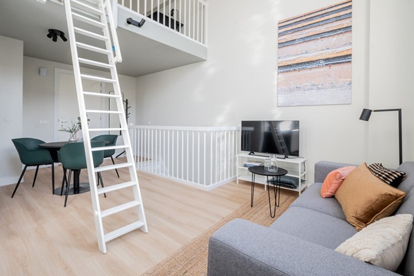 Deze loft maakt indruk met zijn hoge plafonds en een extra loftruimte met uitzicht op de woonkamer – perfect voor wie karakter en charme waardeert. De moderne, open keuken is ideaal om uw favoriete maaltijden te bereiden terwijl u in contact blijft met uw gasten in de woonkamer. De keuken heeft een strak donker design met een contrasterend wit aanrechtblad en is compleet uitgerust met een inductiekookplaat, koelkast met vriesvak, vaatwasser en afzuigkap. De ronde eettafel zorgt voor maximale ruimte, waardoor de keuken perfect is voor gezellige bijeenkomsten. Boven biedt de mezzanine een aparte studeerruimte, terwijl de kelderverdieping de knusse slaapkamer herbergt, bereikbaar via een trap. De en-suite badkamer is een oase van rust met een grote douche met glazen deur, een wastafelmeubel en kalmerende beige tegels.